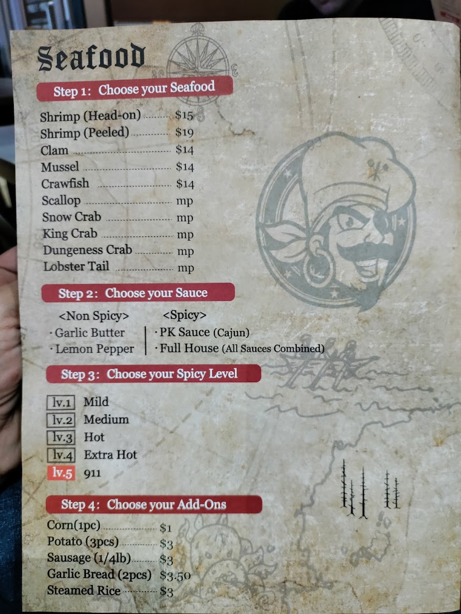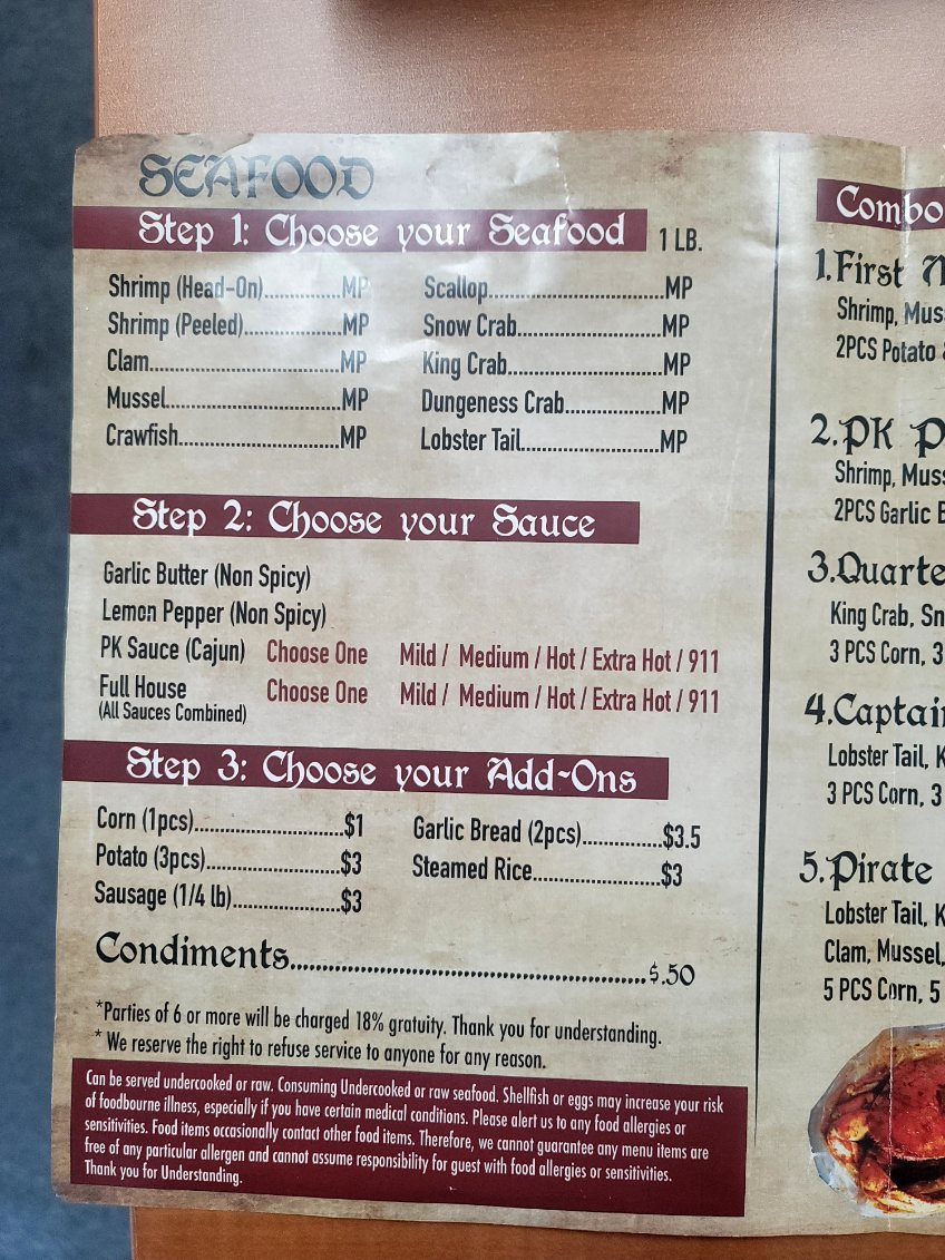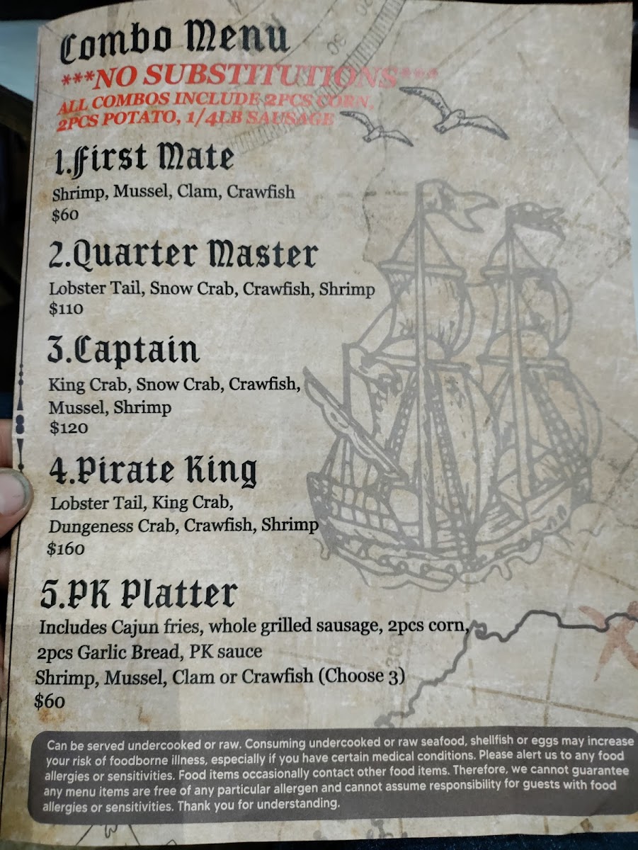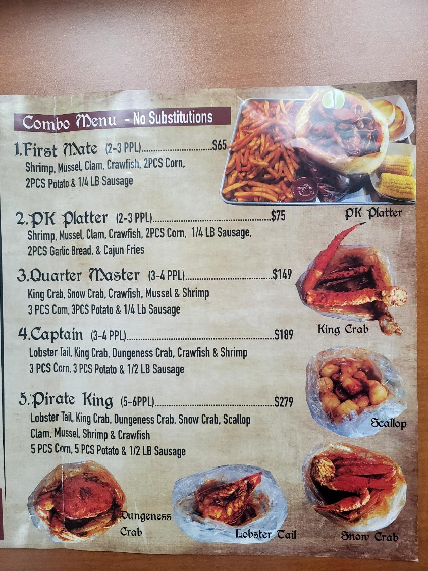 The heart of the menu clearly lies in its seafood offerings. Fresh options such as Clams, Head On Shrimp, Dungeness Crab, and Scallops cater to seafood lovers who appreciate both simplicity and bold seasoning. For those who want variety in one order, the combo selections-PK Platter, Captain, First Mate, Pirate King, and Quarter Master-are perfect for sharing and sampling multiple flavors at once, reinforcing the restaurant’s communal dining appeal.